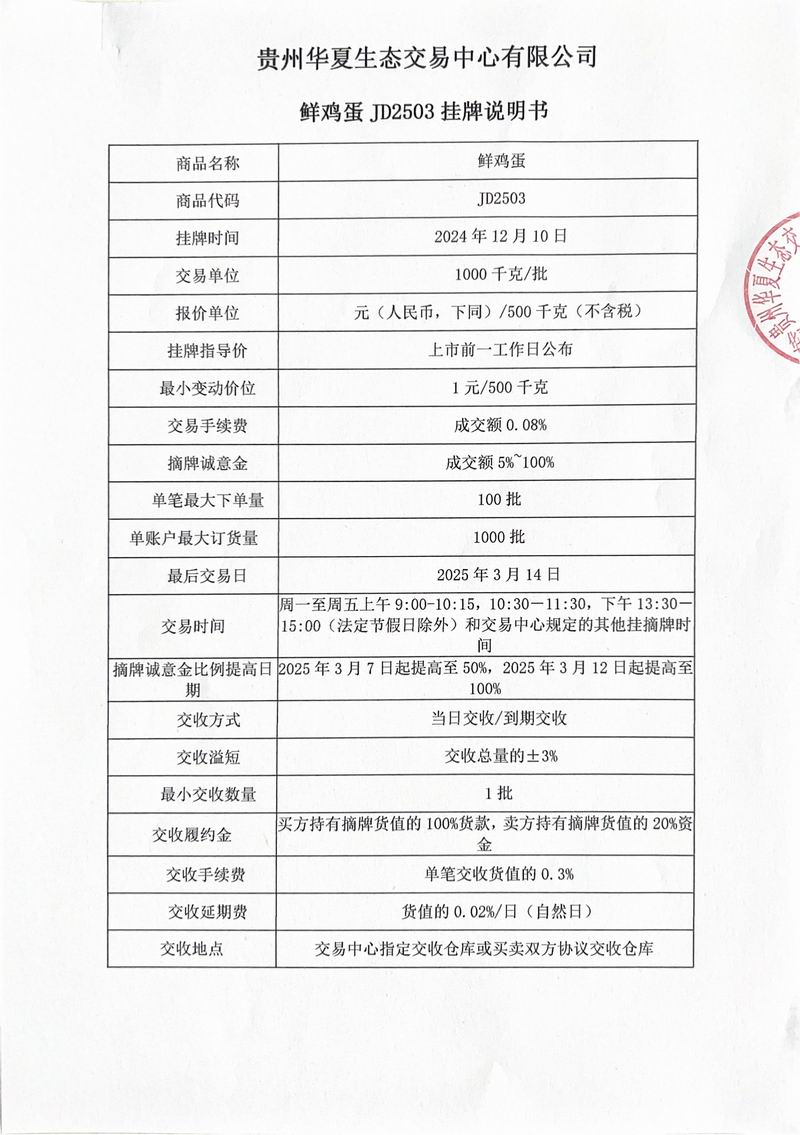 鲜鸡蛋JD2503挂牌说明书